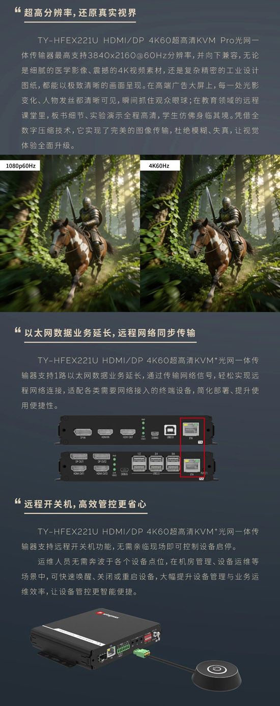 关键词: 天翼讯通、HDMI/DP 4K60超高清、KVM Pro光网一体传输器