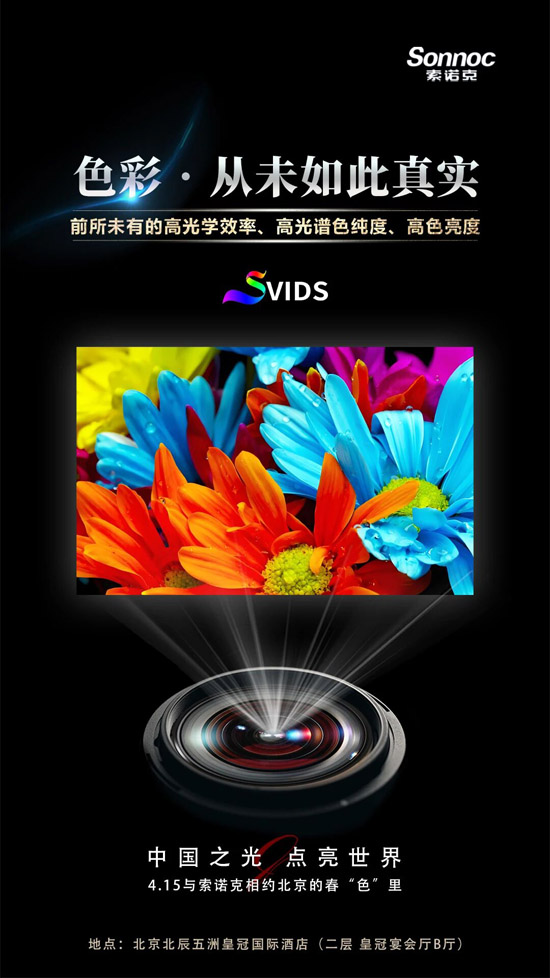 索诺克 S-VIDS 纯三色激光技术以高光学效率、高光谱色纯度、高色亮度,颠覆视觉体验。
