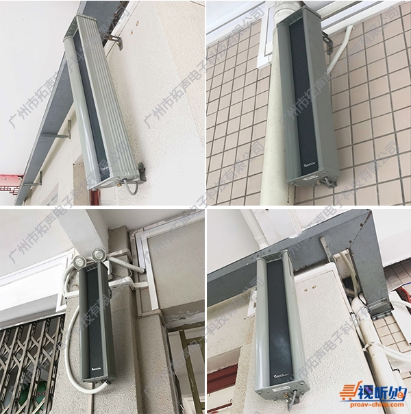 大型室外全天候音柱是铝合金材质,采用壁挂式安装方式,由3个6寸的喇叭组成。
