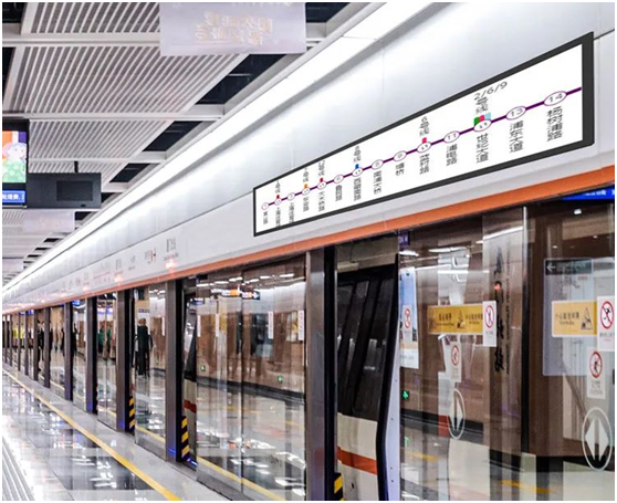 而AOC条形屏,在与地铁系统对接后,可提供全程站点、到站信息动态显示,实现精准站台播报,直观展示轨交线路走向及换乘信息,同时兼容控制终端,实时聚焦政务动态和便民资讯,通过滚动显示即时呈现更多内容。