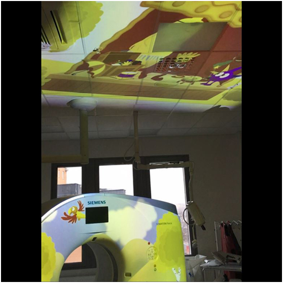 使用投影技术让儿童和成人患者平静下来,缓解他们在做CT扫描检查时的压力,从而加快检查速度。