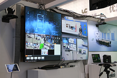 在展会现场的这套智能化数字会议室解决方案由地理位置分开的两个会议环境组成,它以两个多多媒体会议室和两个会议室的互联互同为模式进行演示,而这两个会议室的核心就是小鸟DMIS可视化协作系统。