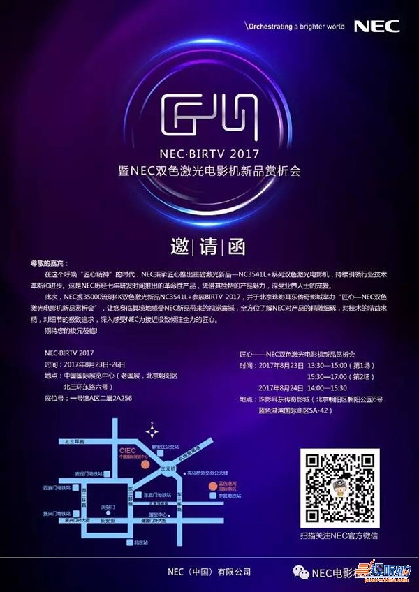 第二十六届北京国际广播电影电视展览会(BIRTV 2017)将于8月23-26日在中国国际展览中心隆重举行。NEC将携革命性产品NC3541L+系列双色激光电影机以及王牌产品NC1201L强势出征BIRTV,为业界人士、媒体人士以及电影发烧友带来震撼视觉体验,诠释NEC对技术、产品追求极致的“匠心精神”。
