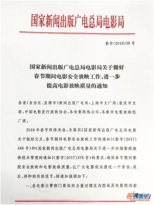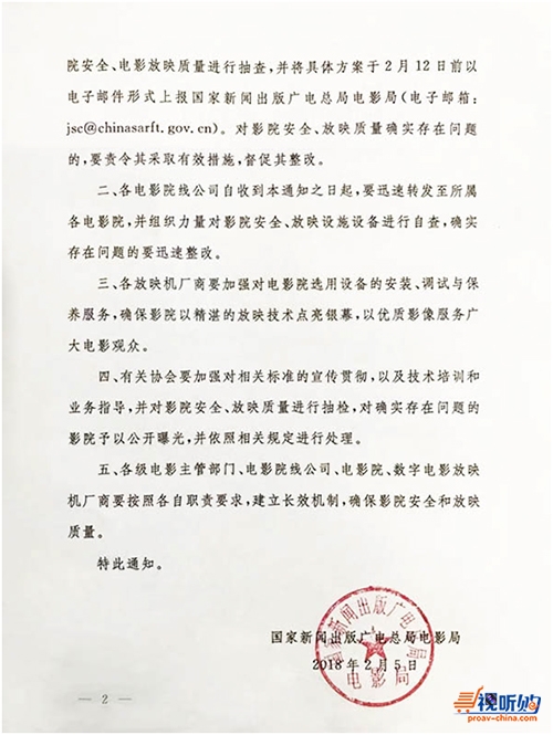 保障电影安全优质放映、提高电影放映质量,是每个电影从业者义不容辞的责任和义务。影院如果忽视放映质量,不仅影响观众观影体验,更会对影院造成损失。尤其春节期间影院客流加大,设备工作时间延长,放映频次增多,容易引发安全事故。因此通知的下发,给电影行业敲响了警钟。通知指出,各放映机厂商要加强对电影院选用设备的安装、调试与保养服务,确保影院以精湛的放映技术点亮银幕,以优质影像服务广大电影观众。