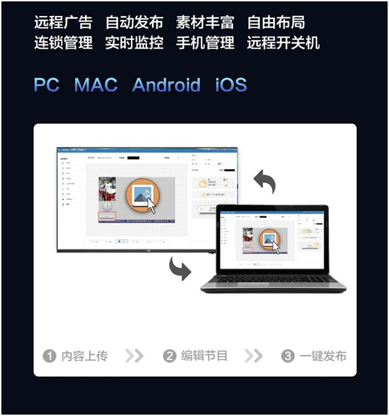 支持本地U盘播放,可自动识别视频、图片、音频等格式,还可以循环播放、间隔时间播放等,使信息展示随心所欲。