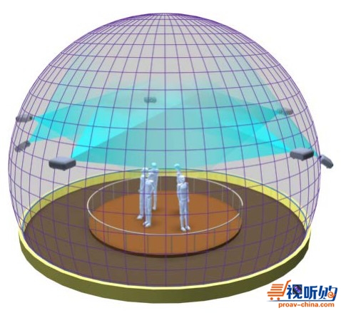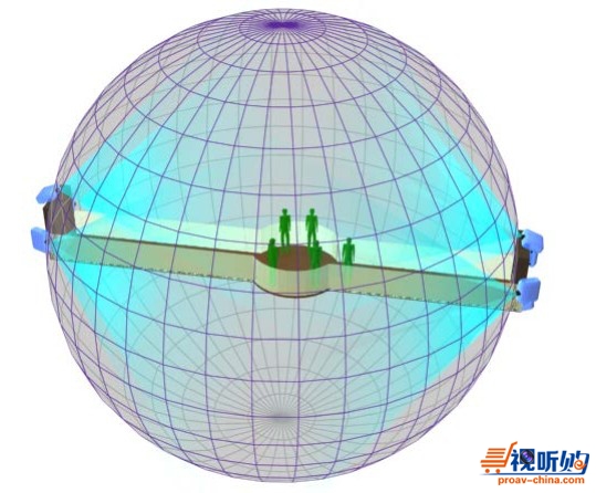 球幕显示面积等于或超过了 1/2 球体,球冠面和地面水平。不同于类型 二,观众完全置身于球体内部,以站立模式自由观赏。影像覆盖了更多的观众视野,适合于演绎丰富的情景视频内容。显示硬件布局上。投影机藏于屏幕之后,屏幕上需要进行开孔透出投影机光线。根据球体的大小及分辨率要求,采用 7 台或更多投影进行画面拼接显示。
