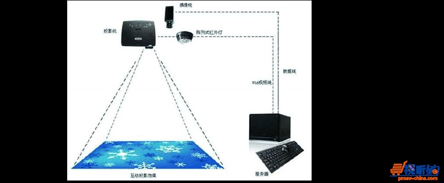 互动投影系统的运作原理首先是通过捕捉设备(感应器)对目标影像(如参与者)进行捕捉拍摄,然后由影像分析系统分析,从而产生被捕捉物体的动作,该动作数据结合实时影像互动系统,使参与者与屏幕之间产生紧密结合的互动效果。