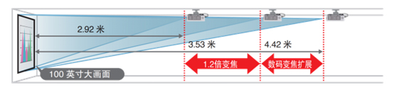 1.2倍变焦镜头实现灵活的1.36–1.64:1投射比,可进行近、远距离大画面投影,适合大型或小型房间内固定安装。当投影距离超出投影机光学变焦范围时,可通过全新搭载的数码变焦扩展功能扩展投影距离。如投影100寸画面时,可由光学变焦的3.53米投影距离扩展至4.42米。