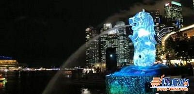 为达到效果,松下选择了3款高亮度旗舰产品,PT-SRZ31KC 三芯片DLP™固态光源激光投影机,亮度为30,000流明,分辨率WUXGA。由于鱼尾狮的外形复杂、现场障碍物较多且投射距离有限,技术人员在投影机上配备了1个ET-D75LE10C和2个ET-D75LE6短焦镜头,并且将投影机设置为竖投模式。这样就可进行必要的覆盖,包括边缘融合。使用特有的模拟软件,图像对齐非常精准,效果惊人。