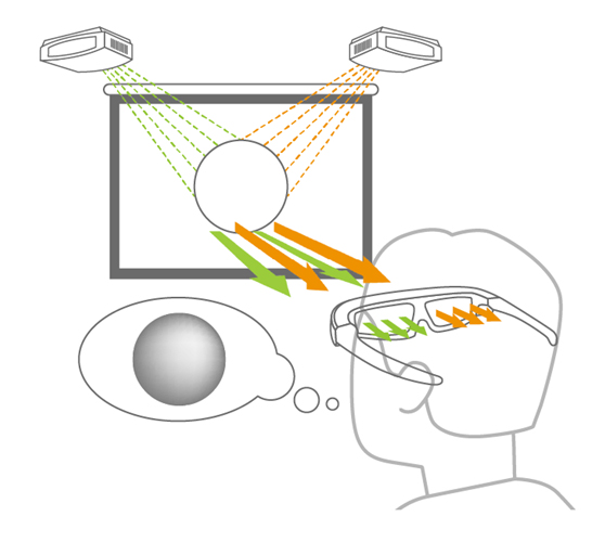 为了让左右眼睛看到不同图像的立体视觉体验,3D视频给左眼观看和给右眼观看的帧画面需要依次交替连续显示,直到视频结束。然后,观看者佩戴的3D眼镜通过特殊方式将每一帧引导到其对应的左右眼睛。例如下图中3D投影仪配合3D眼镜形成的3D视频观看方式。