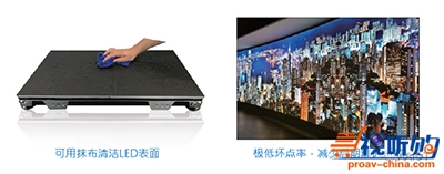 此次AA-IOT提供的是SS(Super Safe Series)系列1.9mm微间距LED,屏幕尺寸6.08m×2.394m,分辨率3200点×1260点。该系列采用COB高密集成封装技术,将LED芯片直接粘贴在PCB上,并采用固晶焊线模塑的工艺组成光学组件。COB的封装技术大大减低了显示屏的坏点率,减少后期维护频率。