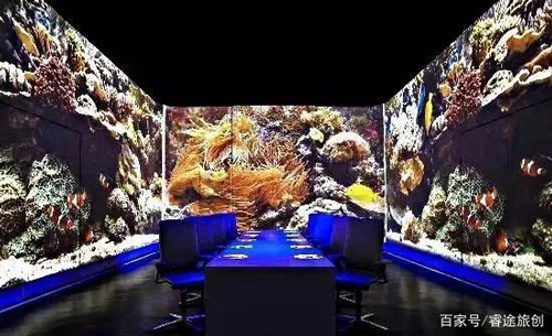 每道菜上桌的间歇,餐厅会根据菜品的特色调整投影内容,所有人都在静静的观赏,沉浸在双重的享受中,无聊的等待在这里根本不会存在。食客在享用星级大厨的手艺同时,也在这个超现实世界中,得到了视觉上的极大满足。