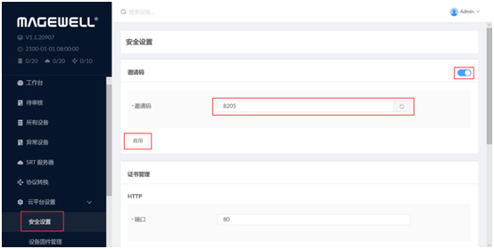 1. 登录Magewell Cloud的Web地址,点击“云平台设置>安全设置”页签,打开“邀请码”开关,复制四位邀请码(如图中的8205,也可点击右侧刷新按钮更换邀请码),再点击“应用”。