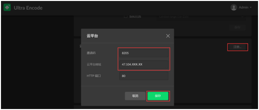 2. 登录编码盒Web GUI,在“通用设置>云平台”页签。点击“注册”,在弹出的页面中填写邀请码(如图中的8205)、云平台地址(如图中的47.104.XXX.XX).点击“保存”。