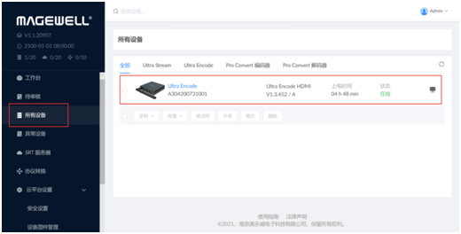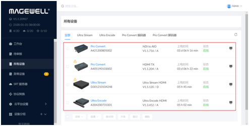 6. 通过上述操作后,多台美乐威IP设备即可注册到Magewell Cloud,用户随后可远程对这些设备进行集中配置和管理。
