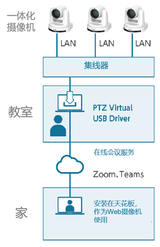 AW-HE20支持UVC协议(全称为USB Video Class,即:USB视频类,是一种为USB视频捕获设备定义的协议标准。),因此可以与现有的基于USB的系统一起使用。仅需一根LAN线缆即可将多台摄像机连接到一台电脑管理,从而节省了布线的投入以及系统安装和配置的时间精力。松下提供了免费软件PTZ Virtual USB Driver,能够将AW-HE20作为网络摄像机使用。即使USB线缆无法到达摄像机的安装位置(如天花板),也可以通过LAN线缆连接,接进在线会议应用。