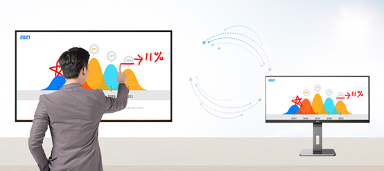 AOC智能会议平板内置专业无线投屏软件EShare,支持安卓、苹果等移动设备及PC投屏,在投屏设备与会议平板连接到同一网络的情况下,点击一键传屏,就能实现多种设备的内容投屏和交互操作,最多可支持9分屏画面。在投屏成功后还支持无线镜像、双向操控等,可大幅节约来回切换设备的时间,提升会议效率,真正做到疾速分享,不受“线”制。