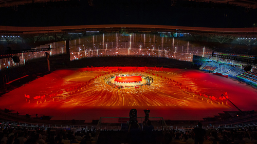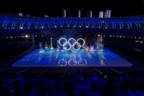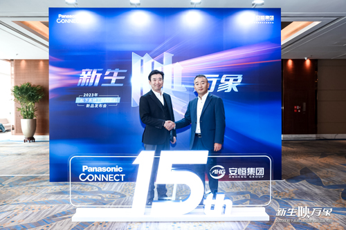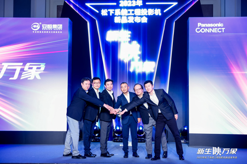 “新生·映万象”2023年松下系统工程投影机新品发布会现场,松下电器(中国)有限公司系统互联营销公司系统投影解决方案营销公司、安恒集团管理层合影