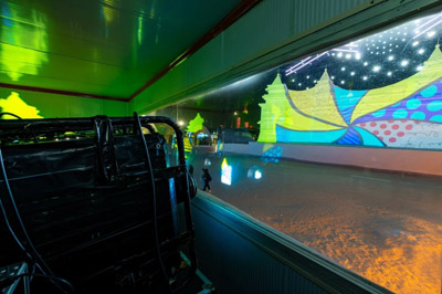 同时,为避免雪的透光性吞噬掉部分投影光,投影设备选择使用5万流明红蓝双色激光投影机,屏前照度达到365Lux。五彩斑斓的光影在雪山上蔓延跃动,为观众留下独属于冰城的浪漫回忆。