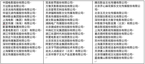 影视基地:横店影视城、西安电影制片厂、广州湾区影视城、深圳国家超高清视频创新中心、海丝厦门电影产业基地、长春国际影都、青岛东方影都、成都青年之光片场、扬州中国电世界、上海纪希片场、郑州新片场、珠影影棚、上海影视乐园、镇北堡西部影城、象山影视城、焦作影视城
