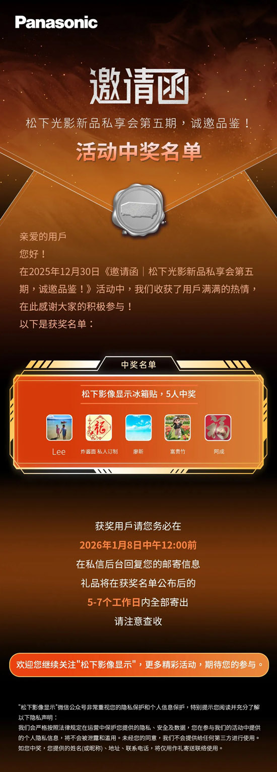 《邀请函|松下光影新品私享会第五期,诚邀品鉴!》活动中奖名单