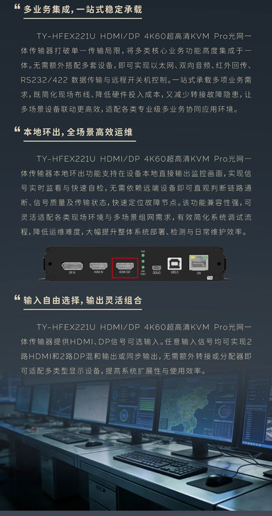 关键词: 天翼讯通、HDMI/DP 4K60超高清、KVM Pro光网一体传输器