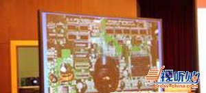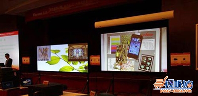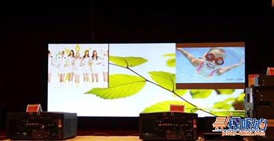 会场正中多屏多画面光学正投融合拼接系统,色彩清新亮丽。这套系统采用了:dnp Supernova Infinity屏幕 84” 1*2,2台DS+10K-M投影机以及Extron MGP 464W WindoWall™ 系统可扩展的多图像拼接墙处理器系统。