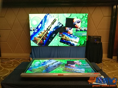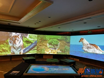 该展项采用2台组SNP-LU6500和1台SNP-LW6500组成,投射画面为宽1.8米,长9.6米的超大三折幕,每个屏幕都可以达到1080P的分辨率,并且支持各个屏幕的旋转,可以应对不同规模的投影、大屏、LED等不同的硬件展示需求。