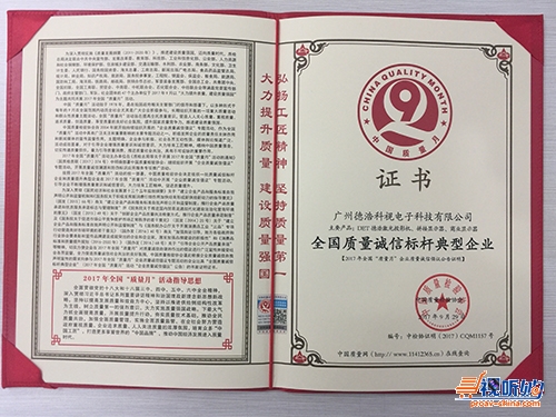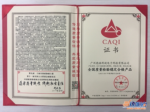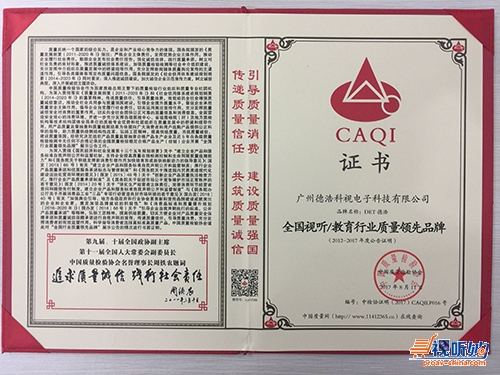 近期,DET德浩在由中国质量检验协会举办的“2017年全国“质量月”企业质量诚信倡议专题活动”中荣获:“全国视听/教育行业质量领先品牌、全国质量诚信标杆典型企业、全国质量检验稳定合格产品”荣誉称号。