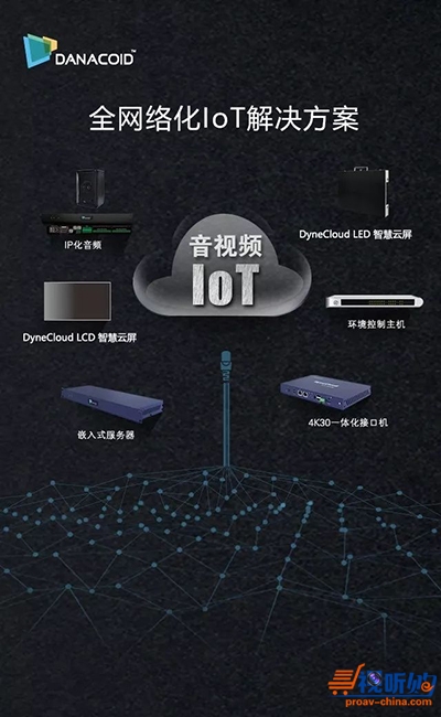 目前,DANACOID力推的是全网络化IoT解决方案。这个方案的最大特点是整个音视频系统内所有单元的IP化,最明显的好处就是极简化、易用,使用一根网线解决音视频的供电、传输、管理和控制。