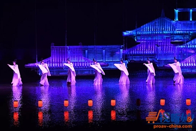 《归来三峡》对“水”元素的创新利用与展示是项目的亮点之一,演员的绝大多数表演也都在水上完成,演出处处可见对“水”元素的尊重与创造性处理。结合舞蹈、投影、朗诵、现场演奏等多种艺术形式与声光电等高新技术呈现方式,再现文人墨客笔下天人合一、水天共舞的诗歌意境。