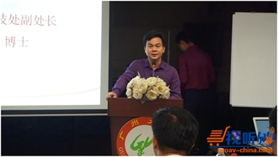 广州大学科技处副处长/博士刘敏聪致辞。刘处表示作为广州大学的代表非常感谢这么多位企业家来到广州大学参加本次研讨会,也很感谢行业企业对广州大学机械与电气工程学院声像灯光学科的支持,同时也介绍了广州大学的学科建设和科研成果,也欢迎各企业与广州大学进行产学研合作,希望通过本次研讨会能对企业能够有所帮助。
