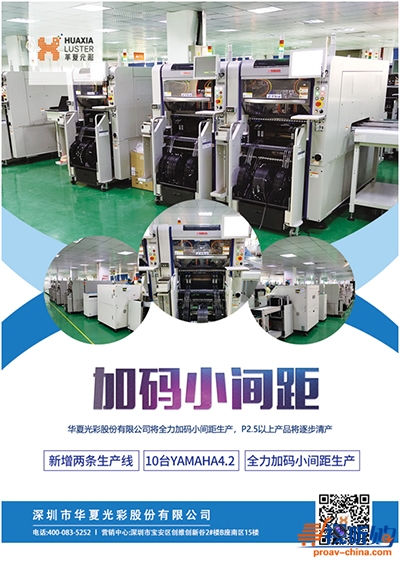 华夏光彩紧抓市场风口,深耕技术与产品开发,精准定位专业细分市场,持续巩固技术、产品、品牌等竞争优势,从战略高度积极布局,大力发展LED小间距。据悉,2020年华夏光彩深圳生产基地P2.5以上产品将全面停产,并且新增2条生产线,引进10台YAMAHA4.2,全力加码P1.X小间距的生产。
