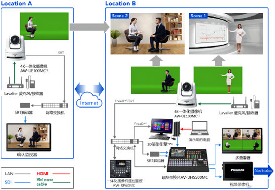 使用支持SRT*协议的一体化摄像机将位于各地的演讲者融合进同一个虚拟活动空间。