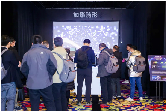 该展项利用松下独特的实时追踪投影技术,应用内置240Hz高刷新率的松下工程投影机PT-SRQ35KC,将高速运动的兵乓球作为追踪对象,投影机配合其动态轨迹投射出相应的影像画面,实现了空间图像再现的动态效果,并且呈现出平滑、几乎无延迟的投影画面。在一些大型舞台上,该技术可以用于追踪快速移动的舞者,实现实时跟踪和投影映射,为观众打造出一气呵成、丝丝入扣的舞台效果。