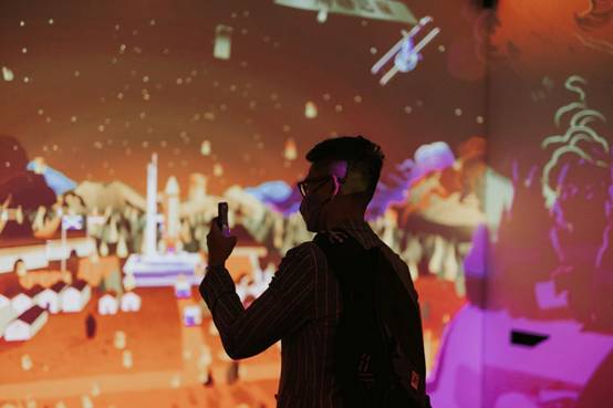 “元.智造工业沉浸式体验空间”,结合投影机与交互设备的技术运用,展示现代工业的智能生产车间,让参观者不用奔赴工业厂房现场,就能获得身临其境,仿佛置身其中。在一个封闭的通道空间,通过投影将空间融为一体,形成一个沉浸式的空间艺术投影效果,采用感应式交互技术,让墙面的画面元素与参观者之间产生互动,观众可随时与厂房内设备交互,查阅需了解的该生产线上相关产品信息,调动多感观体验。清晰、明亮、生动的优质画面,为观者提供如临其境的视觉享受,时而宏大、时而震撼的画面空间,配合产业车间的同期声,引导参观者的情绪,沉浸其中,不觉间,达到真实与虚拟的高度契合。参观者穿梭其中,在虚拟场景中领略真实工厂空间的进入感受,带给参观者不一样的沉浸式互动体验。