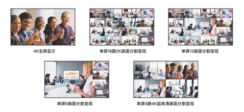 超高清视频会议系统可将多方会议的摄像机、笔记本、PC、DVD等信号同时呈现在一个大屏幕上,既可实现多个4K图像显示,也可实现多个1080P高清图像组合分屏显示,将所有与会人员现场情况、以及主讲人的主讲稿件一览无余。这跨越了空间的阻隔,便利多方会议进行会议沟通研讨和多数据呈现、交互,提升会议效率,为会议的重要数据呈现提供有效的价值,满足公司集团各种会议需求。种类繁多的会议信号在4K超高清画面分割系统中调用十分便捷,用户无须对信号接口插拔,只需点击控制面板即可完成信号的各种切换和控制,让会议沟通更顺畅也更及时。