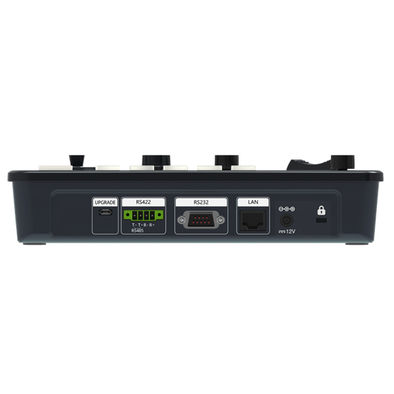 一款迷你精巧型广播应用级控制器,按键布局符合人体工学,变倍桥键与二维遥杆采用更稳定的分布式设计,提升用户使用体验;按键全部选用优质硅胶,彩色背光设计使得光线昏暗的环境下也可操作自如;控制器包含5 路摄像机快捷通道键、5 个无极变速旋钮和4 个彩色LED 显示屏幕,设置简单使用方便;支持一键自动、手动、OPT 聚焦模式并支持7 级 Pan/Tilt 云台转速与Zoom 速度可视调节。